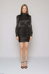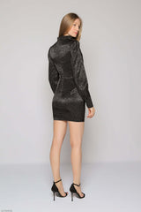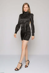 Rasfata-te in eleganta cu rochia noastra din satin negru, decorata cu un print floral discret si volane delicate la tiv. Aceasta rochie imbina perfect rafinamentul cu farmecul feminin, fiind alegerea ideala atat pentru evenimente speciale, cat si pentru iesiri relaxate.