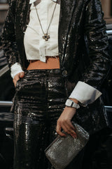 elegant costum negru paiete sacou negru paiete pantaloni lungi negri paiete
