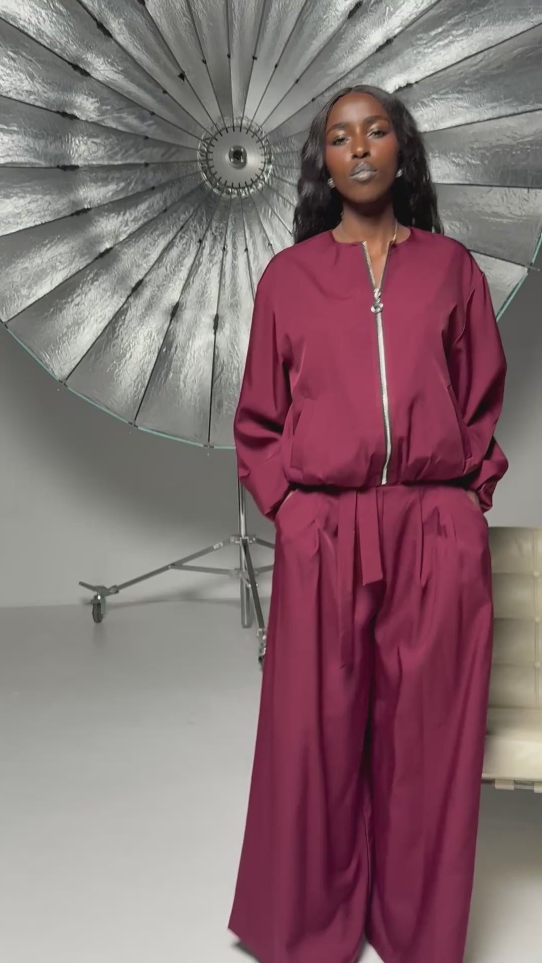 Costum Dama Elegant cu Jacheta Bomber si Pantaloni Palazzo Burgundy VOYAGEUSE