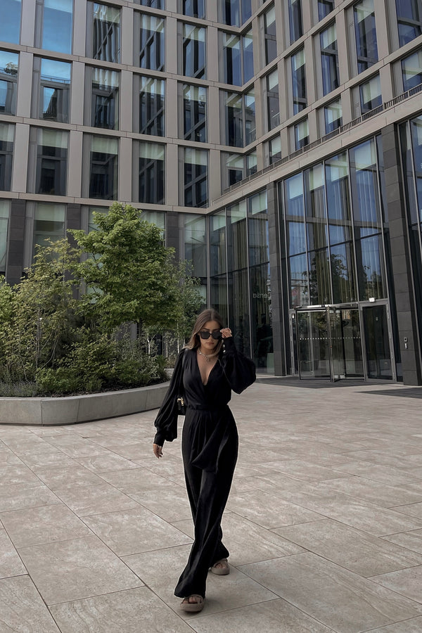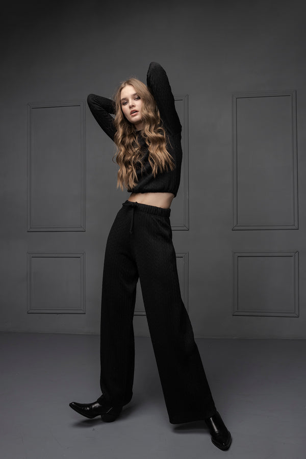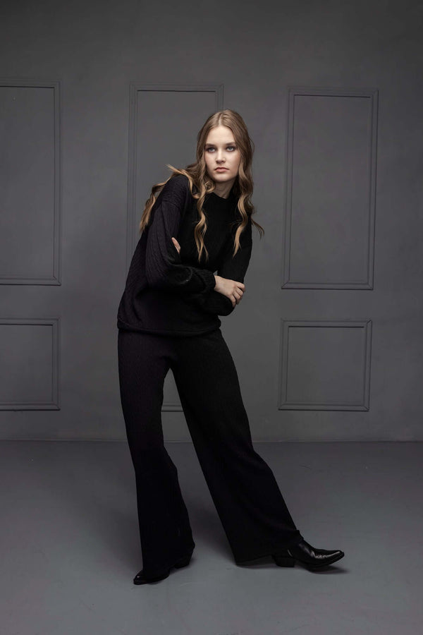 Costum Dama Elegant cu Jacheta Bomber si Pantaloni Palazzo, Negru VOYAGEUSE