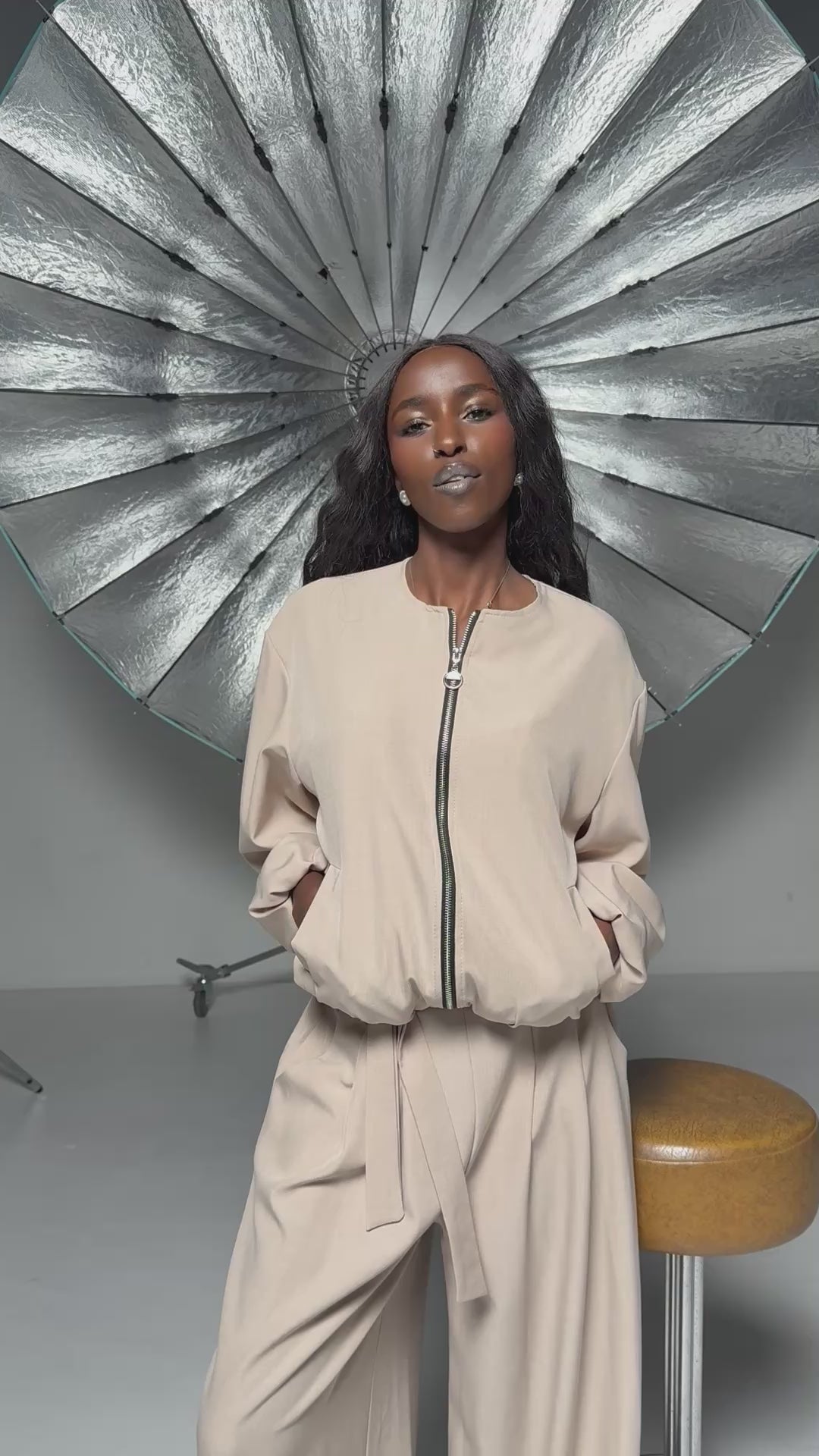 - Cut and design: relaxed-line bomber jacket with slightly puffed sleeves; high-waisted palazzo pants with detachable belt