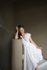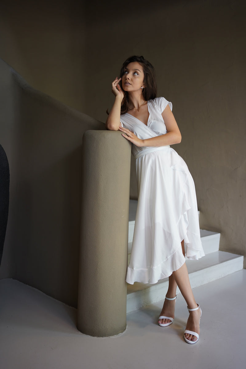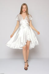 The "Palace" dress combines royal elegance with modern allure . Its flared silhouette, deep V-neck , and playful ruffles exude subtle charm. The adjustable waist adds a personal touch, while the satin viscose chiffon fabric wraps you in luxury . With a medium length and sleeve cords for versatility, "Palace" is more than a dress; it's a unique style statement.