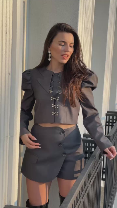 Exprima-ti increderea cu NIOBE, costumul nostru in doua piese care reinventeaza tinutele formale. Alcatuit dintr-un blazer scurt cu maneci bufante si un skort petrecut cu talie inalta, acest ansamblu imbina perfect rafinamentul cu spiritul nonconformist.
