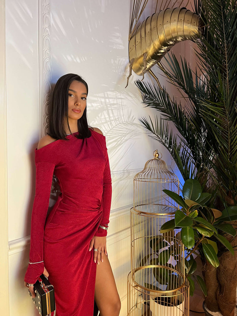Drapajul lateral, realizat manual, conturează talia și creează un efect sculptural, în timp ce umărul decupat adaugă un detaliu modern și subtil senzual.