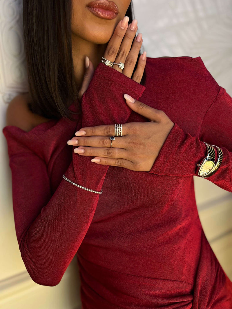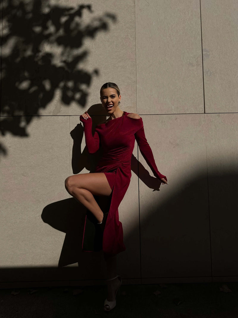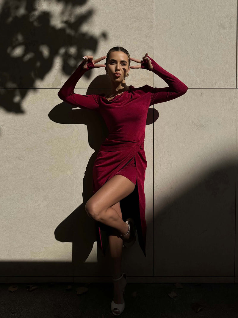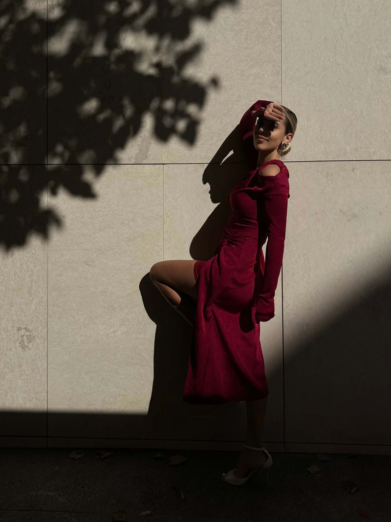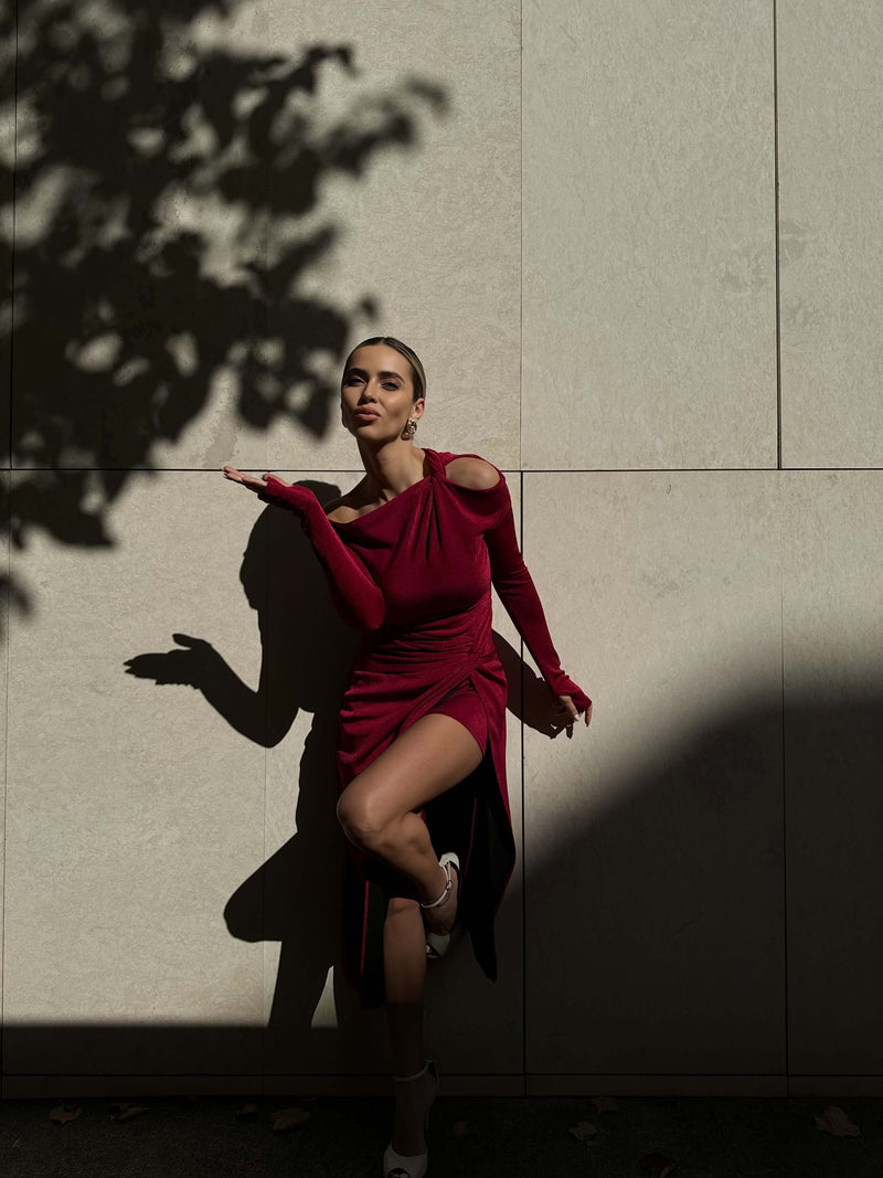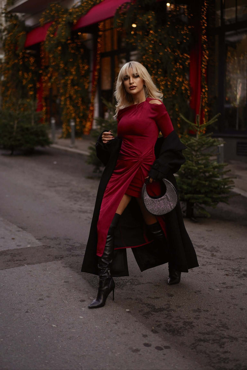 ARLU este rochia care îmbină perfect eleganța catifelei cu o croială sculptată, creată pentru a defini o siluetă fluidă și feminină.