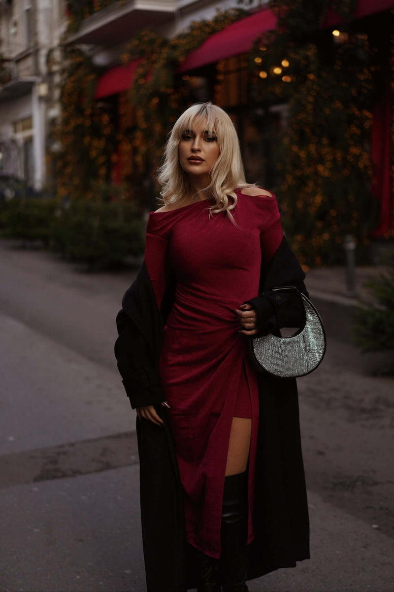 Rochie catifea cu drapaj, burgundy, Arlu